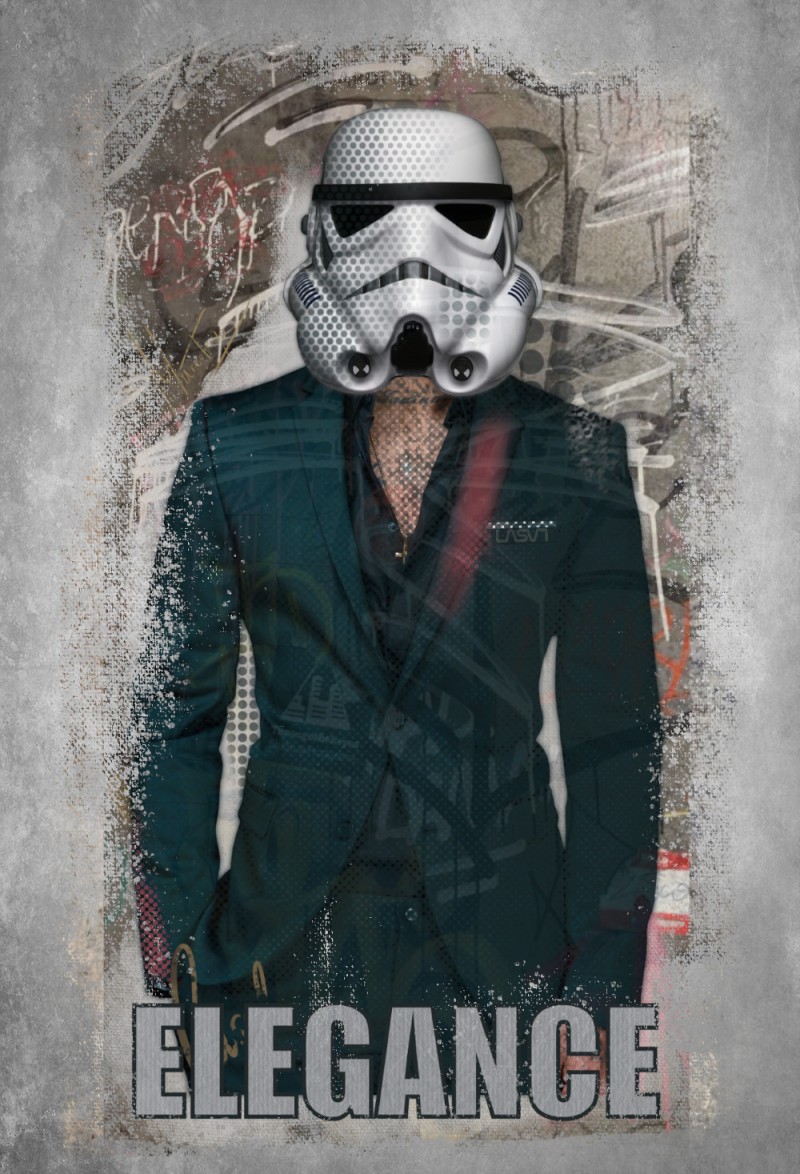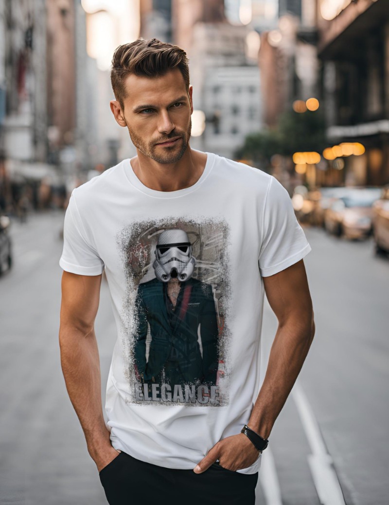 El toque de clase del Imperio. Un diseño que fusiona el icónico casco del Stormtrooper con un traje elegante. El arte urbano sobre base blanca es la definición del estilo geek chic.