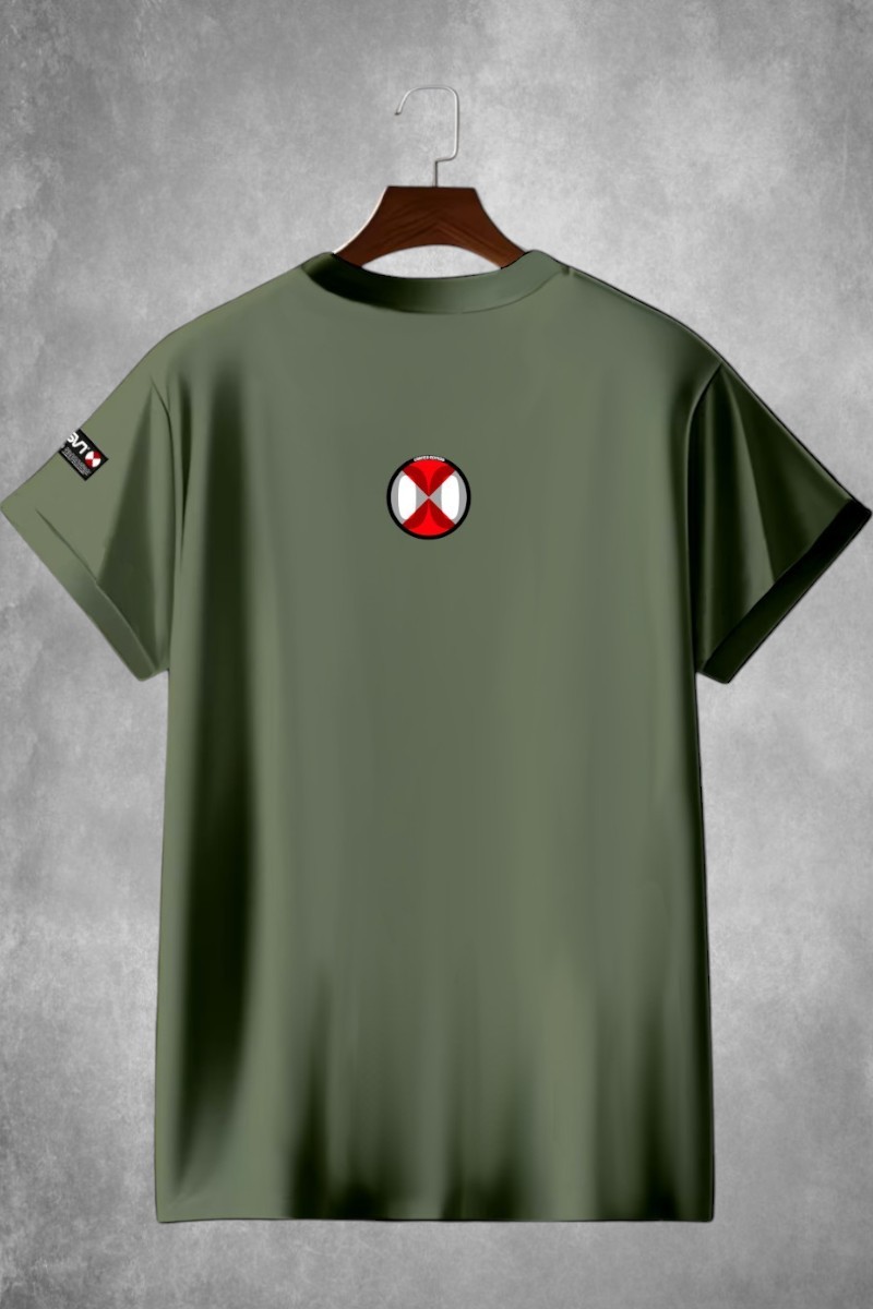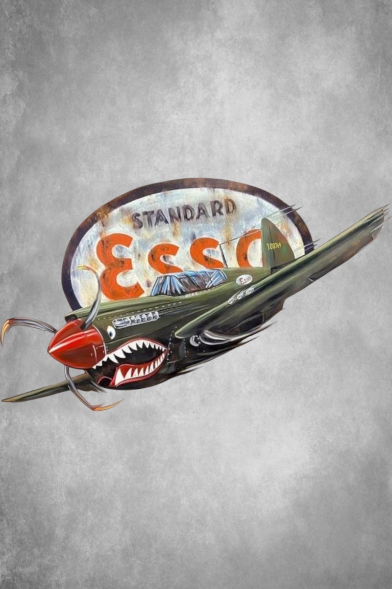 Homenaje retro a la velocidad y la aviación vintage. Con un fondo clásico de la gasolinera Esso y un caza de la Segunda Guerra Mundial con dientes de tiburón. Color caqui, ideal para un estilo robusto y aventurero.