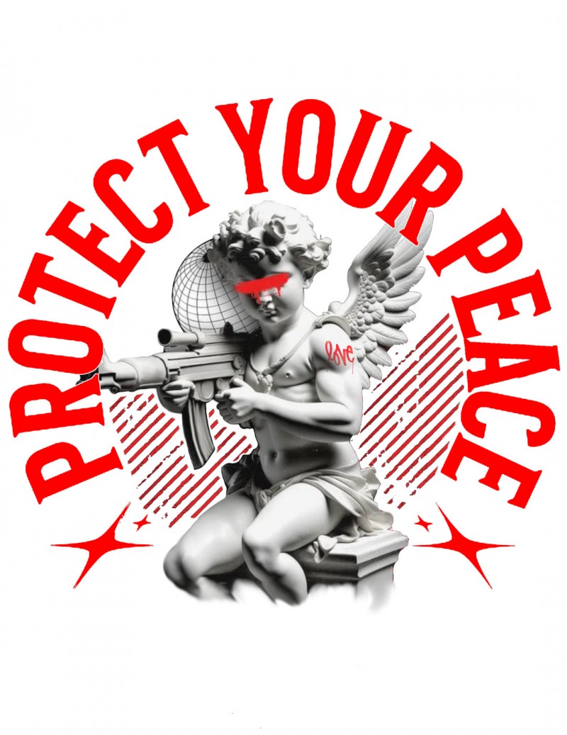 Un diseño de streetwear con un mensaje poderoso. Presenta una estatua de ángel o querubín con un arma, rodeado por el texto rojo «PROTECT YOUR PEACE». El contraste dramático sobre el negro es ideal para un look fuerte, audaz y con un toque de arte clásico rebelde