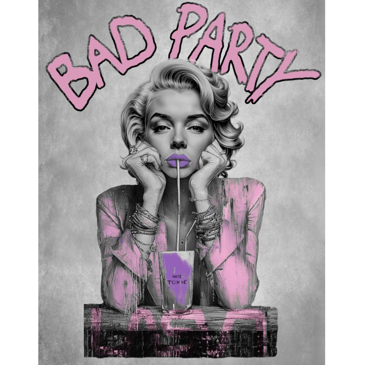 ¡El ícono del glamour con un toque rebelde! Este diseño presenta a una Marilyn Monroe moderna con labios morados, disfrutando de una bebida y el atrevido texto «BAD PARTY» en rosa neón. Su corte en V y la base blanca la hacen perfecta para un look chic, descarado y con un toque de fiesta inolvidable.