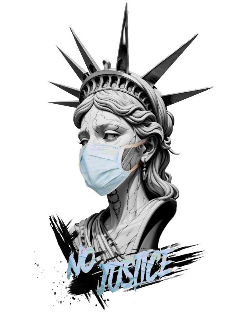 Un diseño que captura la esencia de la protesta actual. Presenta a la emblemática Estatua de la Libertad con una mascarilla, bajo el lema «NO JUSTICE NO PEACE». Su corte largo y desenfadado y el color negro desgastado le dan un aire atrevido y urbano. ¡Una prenda con un mensaje social potente y muy relevante!