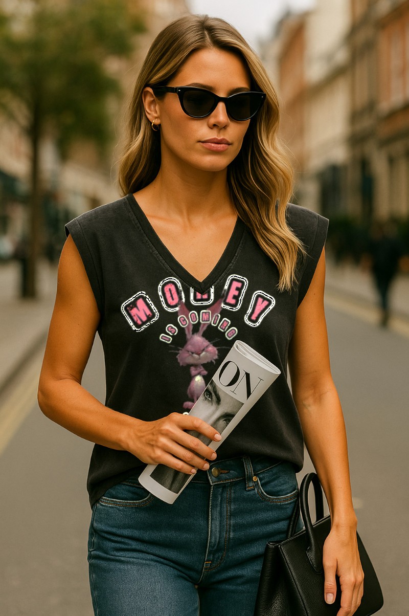 ¡Estilo, actitud y manifestación! Esta camiseta de corte en V presenta a un conejo irónico y el mensaje de poder en rosa neón. Confeccionada en negro para un look audaz y empoderador. Perfecta para llevar tu visión con confianza.