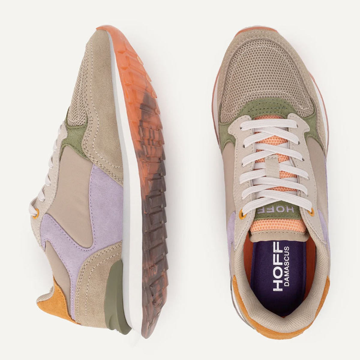 Damascus es una zapatilla deportiva, estilo casual. Sneakers cómodos, fabricados en piel y textil. Mediasuela eva y suela de goma dentada. Plantilla de memory foam extraible. Color beige-lila. Zapato sport, para combinar con tu estilo urbano.